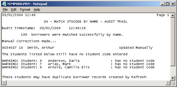 When all unmatched students have been identified or skipped over, a report will be printed of changes made.